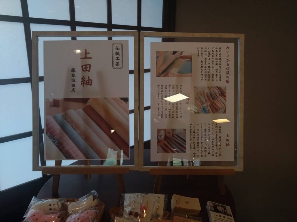 日本三大紬の一つ『上田紬』を販売するコーナーを新設致しました。お食事の際に、どうぞご覧くださいませ。